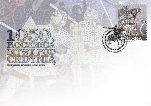 Na znaczku i kopercie FDC (koperta pierwszego dnia obiegu) przedstawiono fragment mozaiki spod Góry Czcibora, przedstawiającej wyobrażenie bitwy pod Cedynią. Na kopercie FDC (koperta pierwszego dnia obiegu) również przedstawiono fragment mozaiki spod Góry Czcibora przedstawiający wyobrażenie bitwy pod Cedynią.